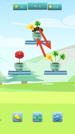 1、留意花瓶的颜色提示,把屏幕下方的花朵拖动到对应色系的花瓶里,以此完成插花操作。