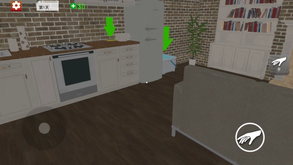 2、厨房的冰箱、炉灶区域是关键,根据绿色箭头提示,优先处理冰箱旁的待清理物品,再清洁炉灶表面,利用手势功能高效完成该区域的清理任务,快速提升分数。