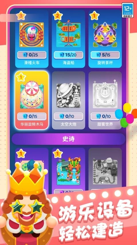 4、乐园布局完全固定,只需要简单的交互点击进行建造就能推进发展,无需耗尽进行重新布局和规划安排。