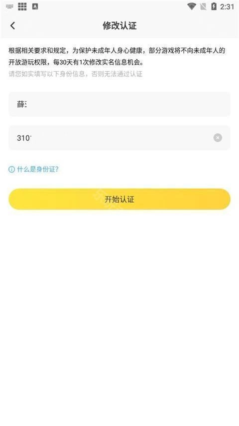 4、输入最新的实名信息,点击下方的“开始认证”按钮即可
