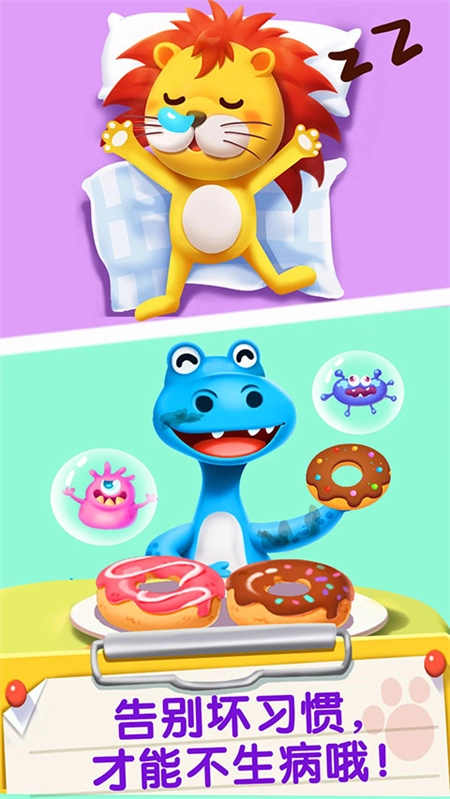 在游戏中,宝宝将扮演小医生为前来看病的小动物进行治疗,比如低烧可以用退烧贴,高烧可以选择打针,睡觉乱踢被子会导致着凉感冒,游戏真实模拟了医院看病场景,给宝宝带来最丰富的游戏体验。