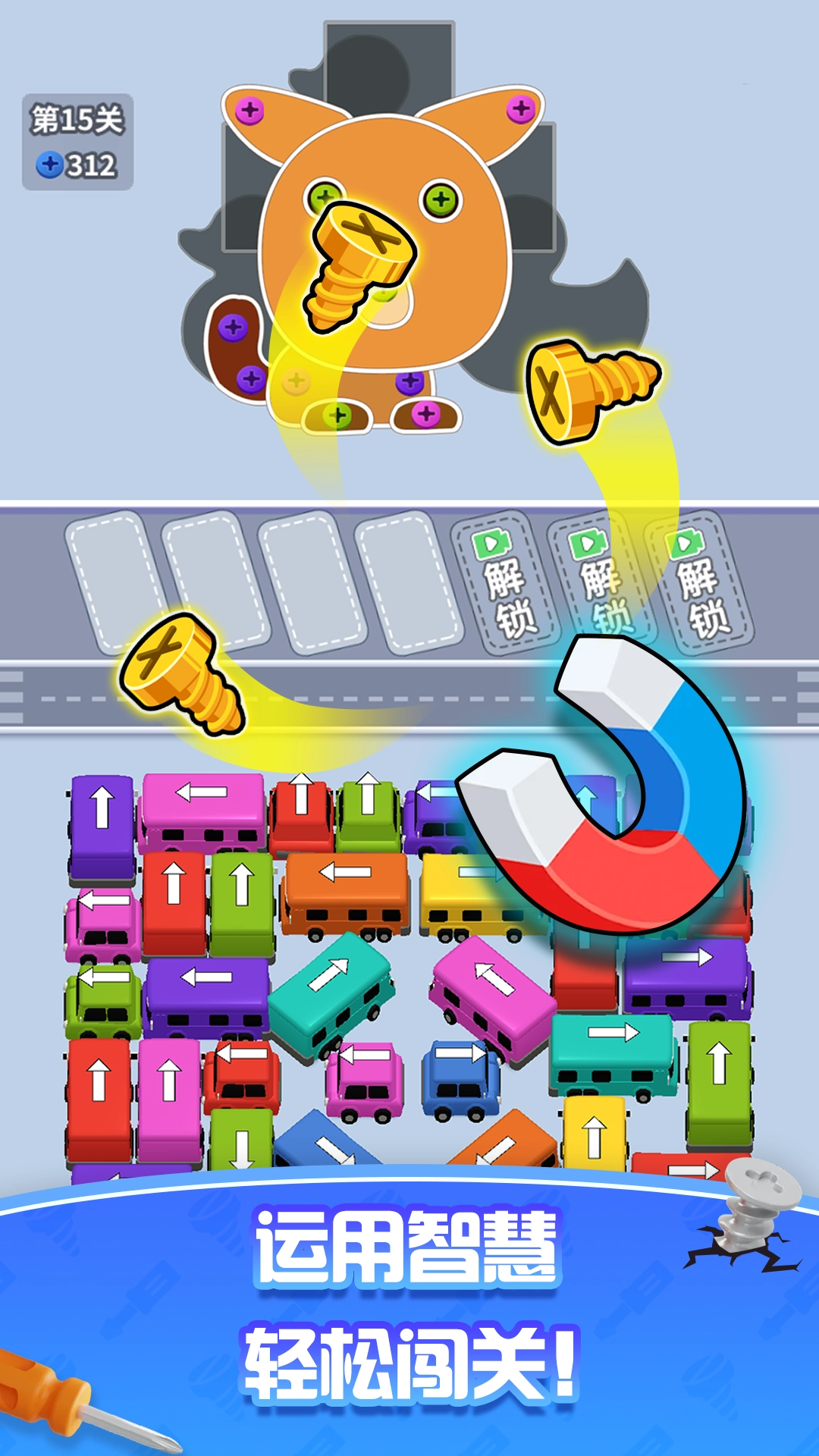 3、玩家要仔细观察螺丝与车辆的连接关系,合理拧动螺丝,才能顺利挪车,完成各种趣味挑战。