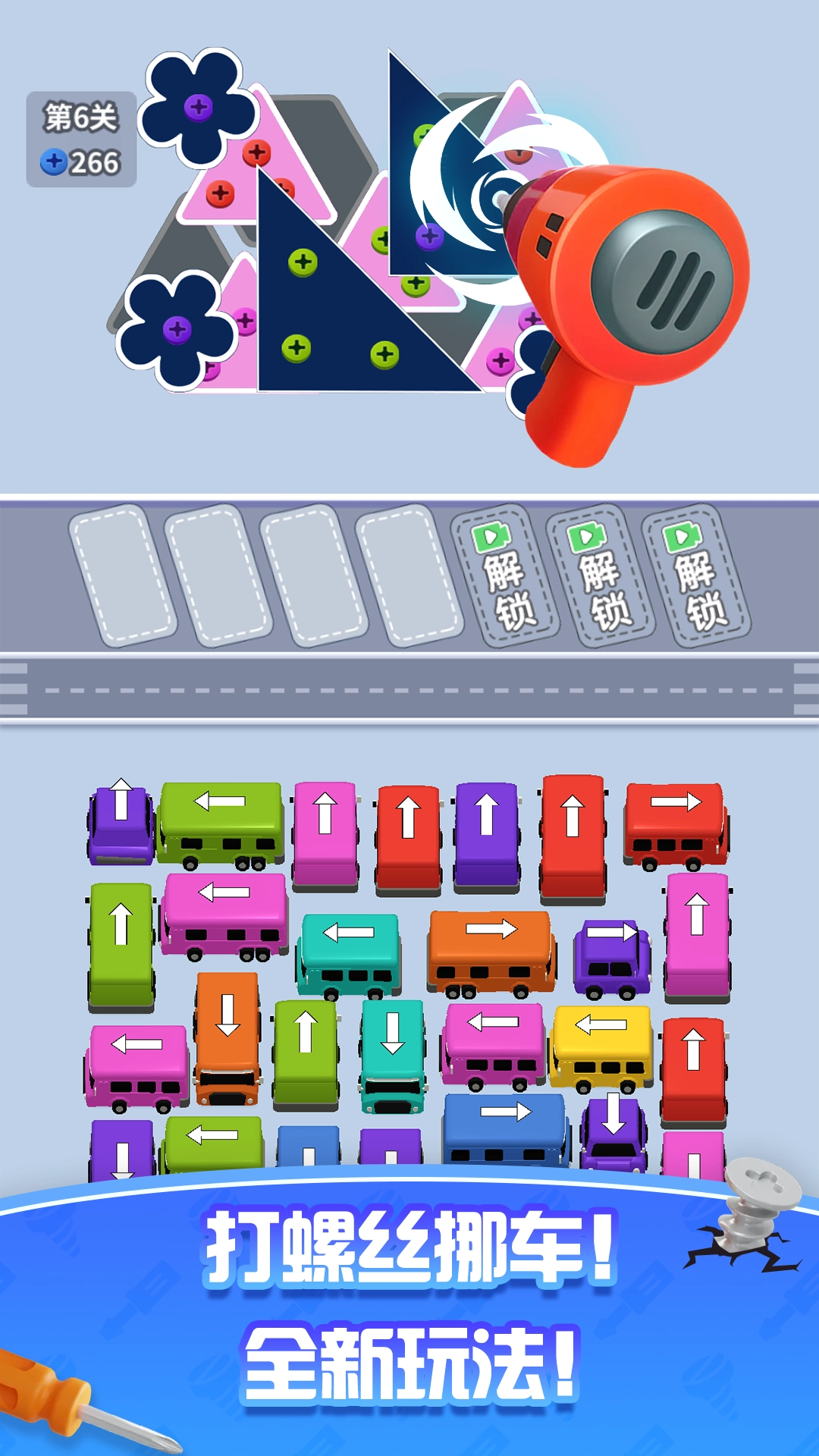 挪车螺丝王是一款玩法多样的解谜类游戏。在游戏里,玩家能够随心所欲地消除各类螺丝,为挪车行动做足充分准备。场景中的汽车全都挤成一团,玩家需寻觅恰当的挪车路线,把不同的汽车挪动到适宜位置,迅速找出一条合适的挪车路径,在各个场景中都能畅快地挪车,尽情感受丰富多样的玩法。