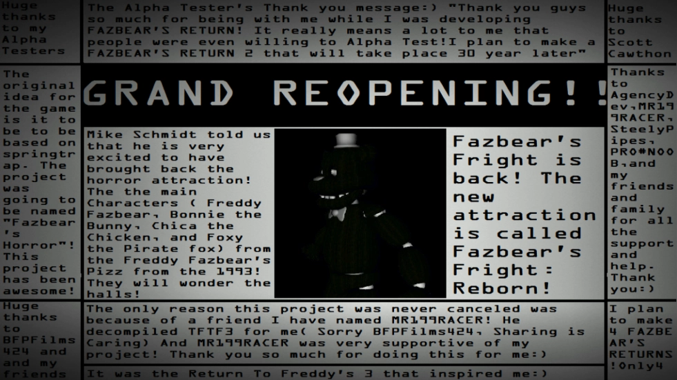 《玩具熊的午夜惊魂同人游戏——FazbearReturn1》(FazbearReturn1)是一款基于著名恐怖游戏系列《玩具熊的午夜惊魂》(FiveNightsatFreddy's,FNAF)创作的同人游戏。