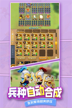 五大兵种一键合成,佛系挂机获取超高资源收益,自动推图扫荡更为轻松,多种休闲护肝设计助力畅游三国!