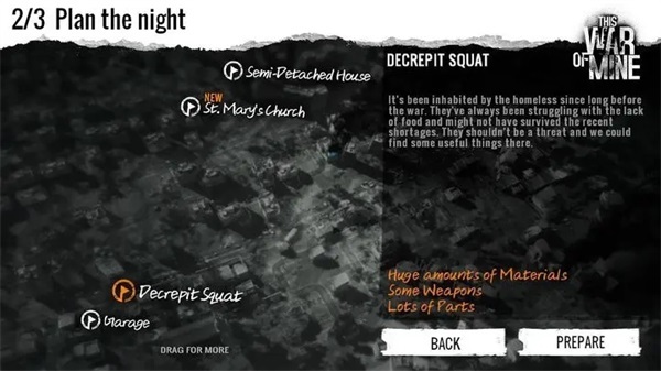 在黑夜,大部分地区的战争会暂时停歇,但仍有部分地方有一定几率陷入交战状态,这些处于交战的区域无法进入,这种情况大概会持续8 - 10天。在此期间,玩家能够操控角色前往其他区域的废墟寻觅物资。由于区域不同,物资种类的丰富程度也有所差异。部分区域会有幸存者存在,要是玩家亮出武器或者踏入禁区,就会遭到幸存者的警告与攻击。而且,偷窃幸存者的私有物资同样会引发警告和攻击,不过要是没被发现,例如在关着门的屋内偷窃则另当别论。当然,也存在一些愿意和玩家进行交易的幸存者。此外,玩家还有可能遭遇土匪,土匪只要一看到玩家操控的角色便会发动攻击,几乎所有土匪都配备枪支,所以玩家在前期很难正面战胜土匪。(若对地图介绍较为细致,会显示有无辜民众或未携带枪支的士兵,而危险通常指的是携带枪支和武器的军人。)