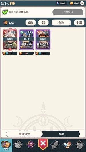 2、通过底部的角色按钮,查看已有角色信息,并对其进行升级和进阶提升实力。