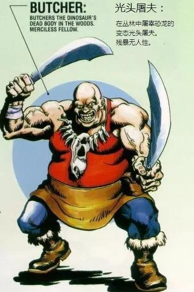这个光头相当残忍,是偷猎者的头子,经常把恐龙砍着玩,甚至喜欢生吃恐龙肉。为基地贡献不少品种的恐龙基因