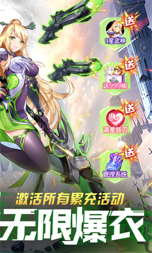 1. 上线就送管理系统,免费充值拿海量水晶,在线领高抽,极品战姬抽不停!还能激活所有累充活动