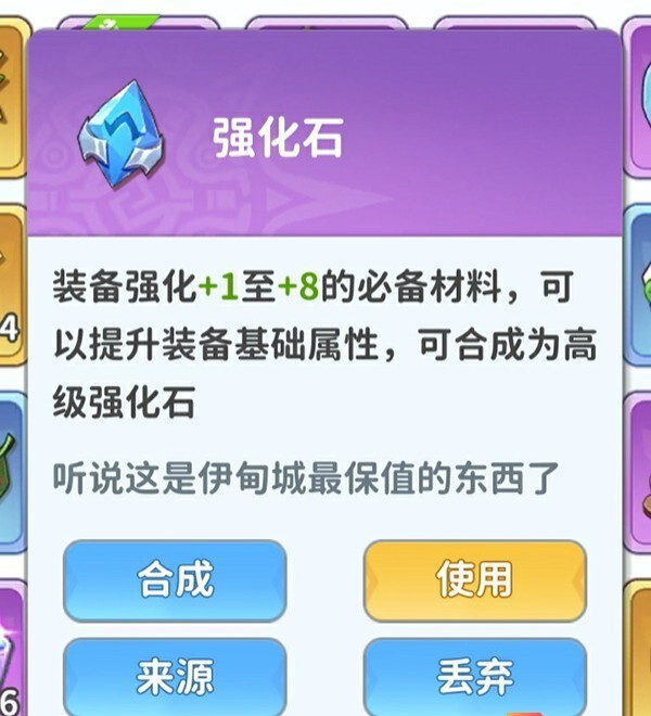 强化石:是装备强化从 +1 到 +8 的必备物品,可提升装备基础属性,还能合成高级强化石。获取途径为宠物探索、狩猎龙兽以及声望商店。