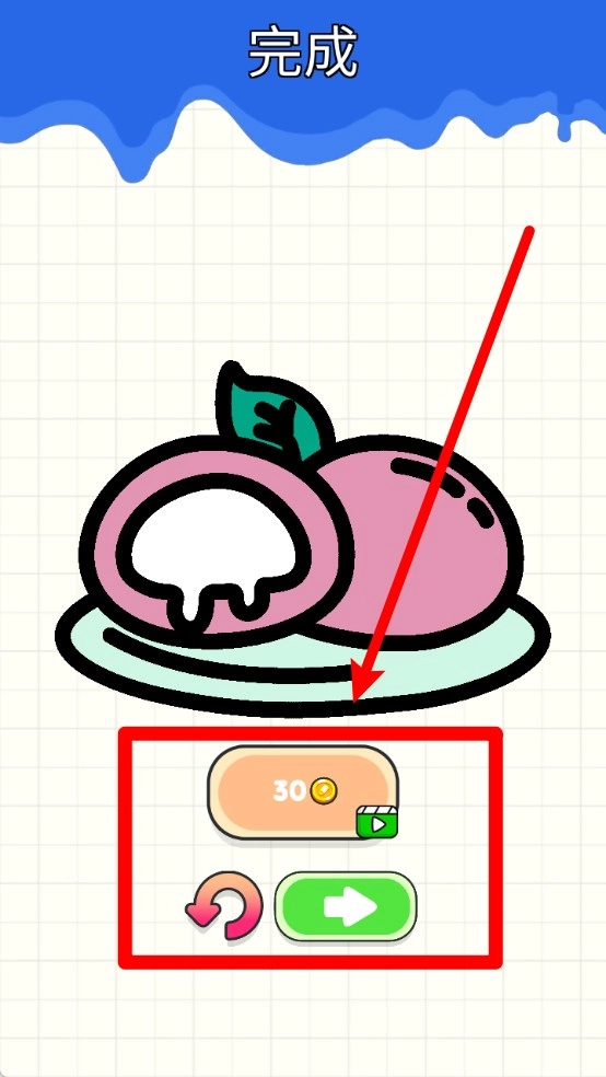 3. 任务完成:当绘画完成后,系统会自动为画作上色,随即展示完成界面。与此同时,玩家将获得金币奖励,并且能够选择进入下一关。